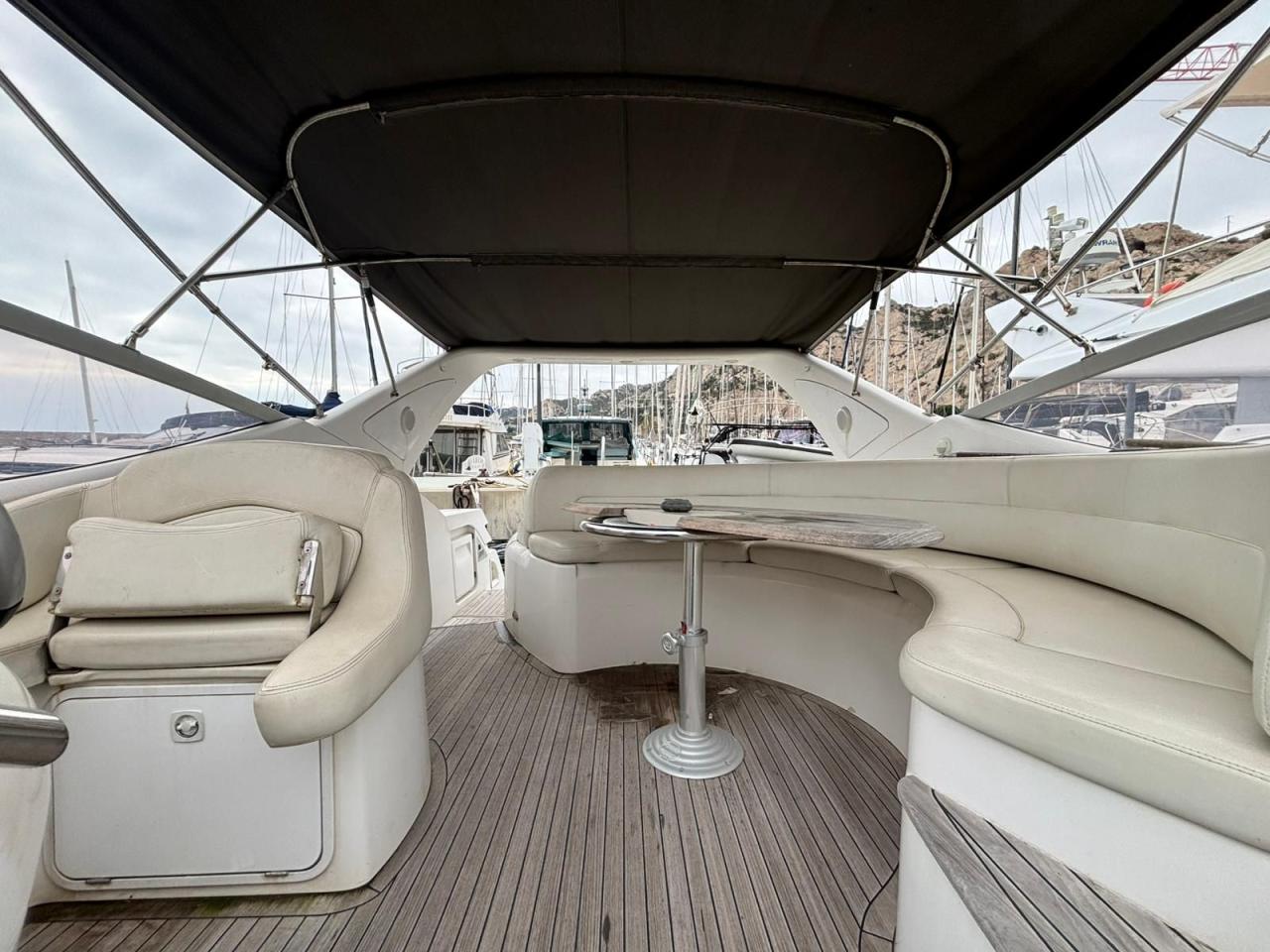 Le cockpit est spacieux et convivial, idéal pour recevoir. Il bénéficie d’un grand coffre électrique, très pratique pour ranger l’annexe, un paddle ou tout le matériel nautique.