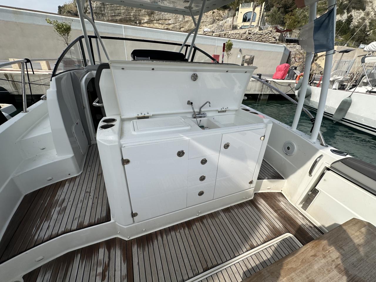 A major highlight of this boat — and a rare feature in this segment — is the onboard generator. The boat is equipped with a generator that allows the use of 230V even at anchor: making coffee, cooking, using outlets or electrical appliances just like at home. The generator has only been used for 3 hours, so it's practically new. This is an extremely rare feature on Cap Camarat 10.50 WA boats and highly sought after for increased autonomy while at anchor. This feature significantly enhances the boat’s value and distinguishes her from many comparable units on the market.