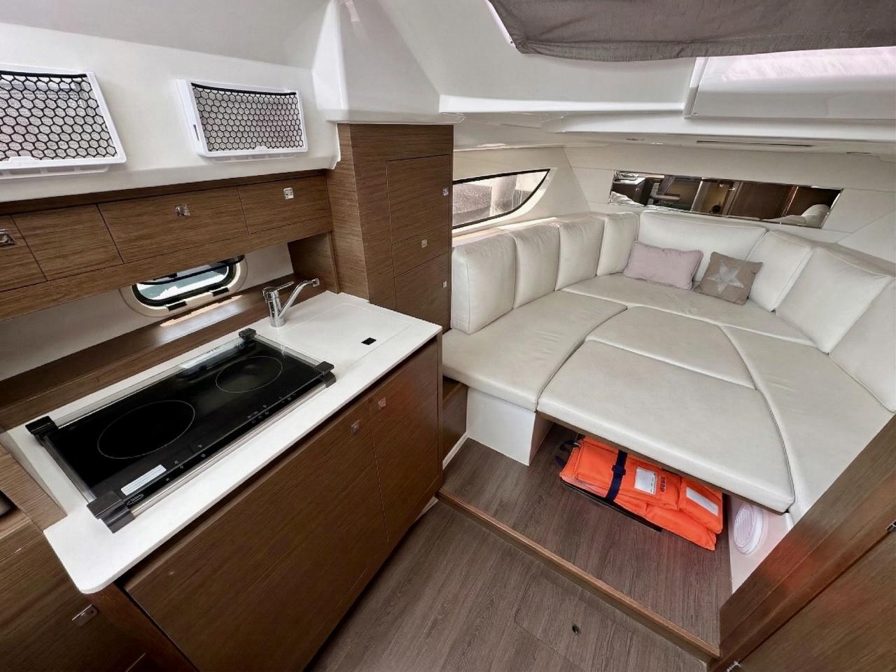 Inside, the accommodation offers two comfortable double cabins, a fully equipped galley with induction cooktop and electric refrigerators, and a bathroom with electric toilet. The interior is bright, modern and intelligently designed, making this model suitable not only as a high-performance day boat but also as a true weekend cruiser.