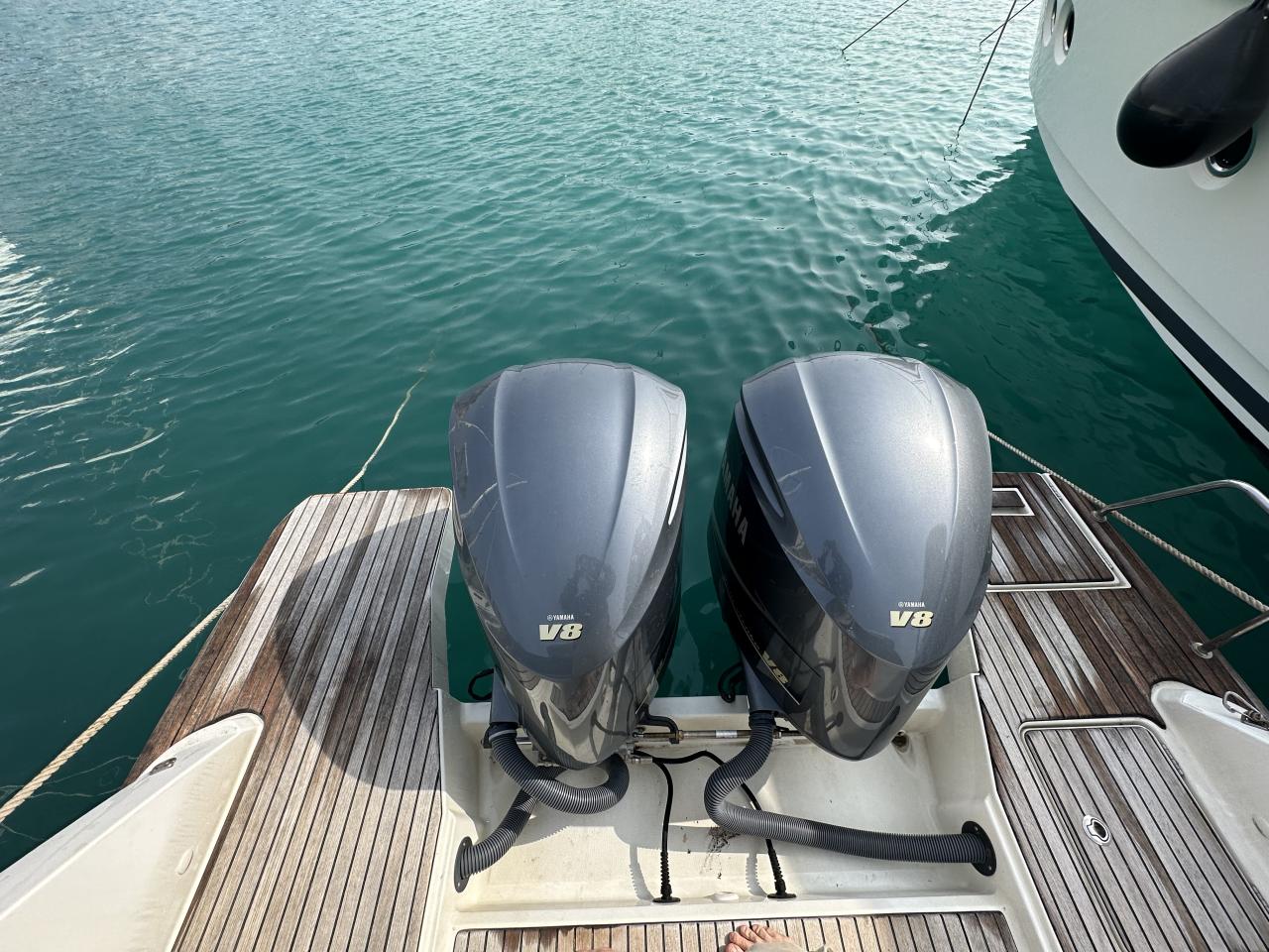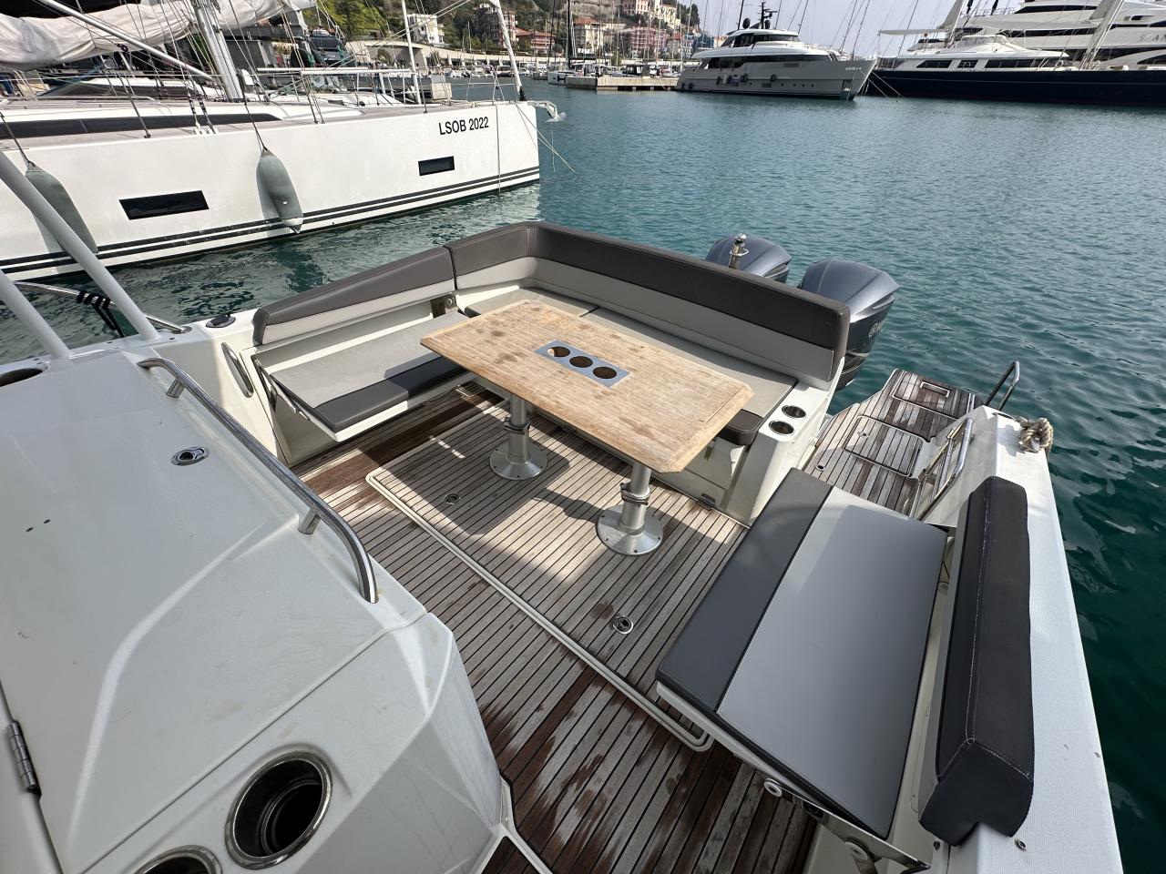 Externally, the boat features a rigid hard top for protection and style, bimini, teak cockpit and deck areas, generous forward and aft sunbathing spaces, cockpit table for entertaining, large aft bathing platforms and stainless-steel swim ladder. The layout is designed for relaxation, social gatherings and easy circulation around the deck.