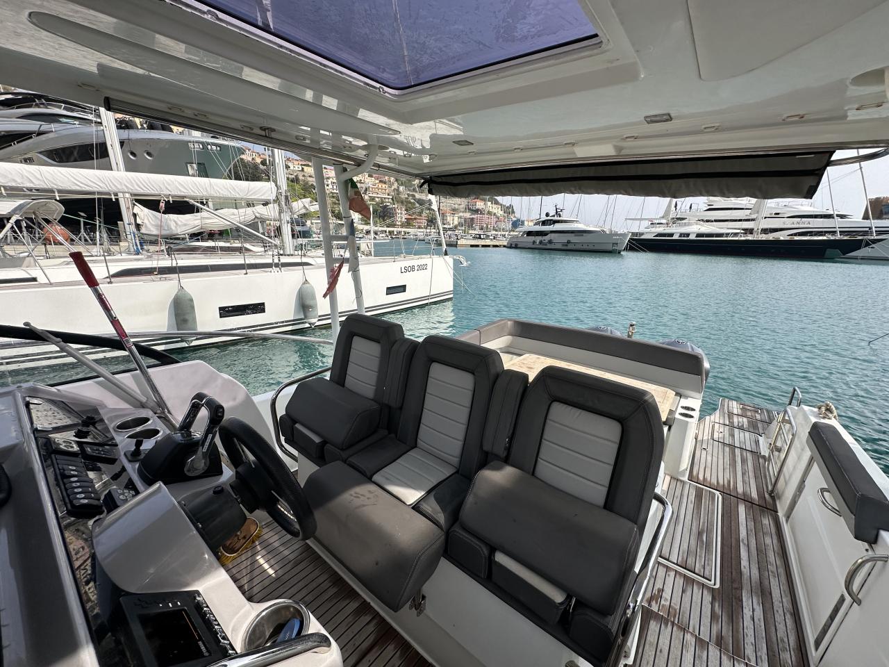 Navigation and maneuvering equipment include Garmin GPS, Garmin 215 AIS VHF, AIS system, automatic Zipwake trim tabs for optimal running attitude, Quick bow thruster for effortless harbor maneuvers, and a Lewmar 1000W electric windlass with 40 meters of chain. The helm station is ergonomically designed, providing excellent visibility and intuitive control.
