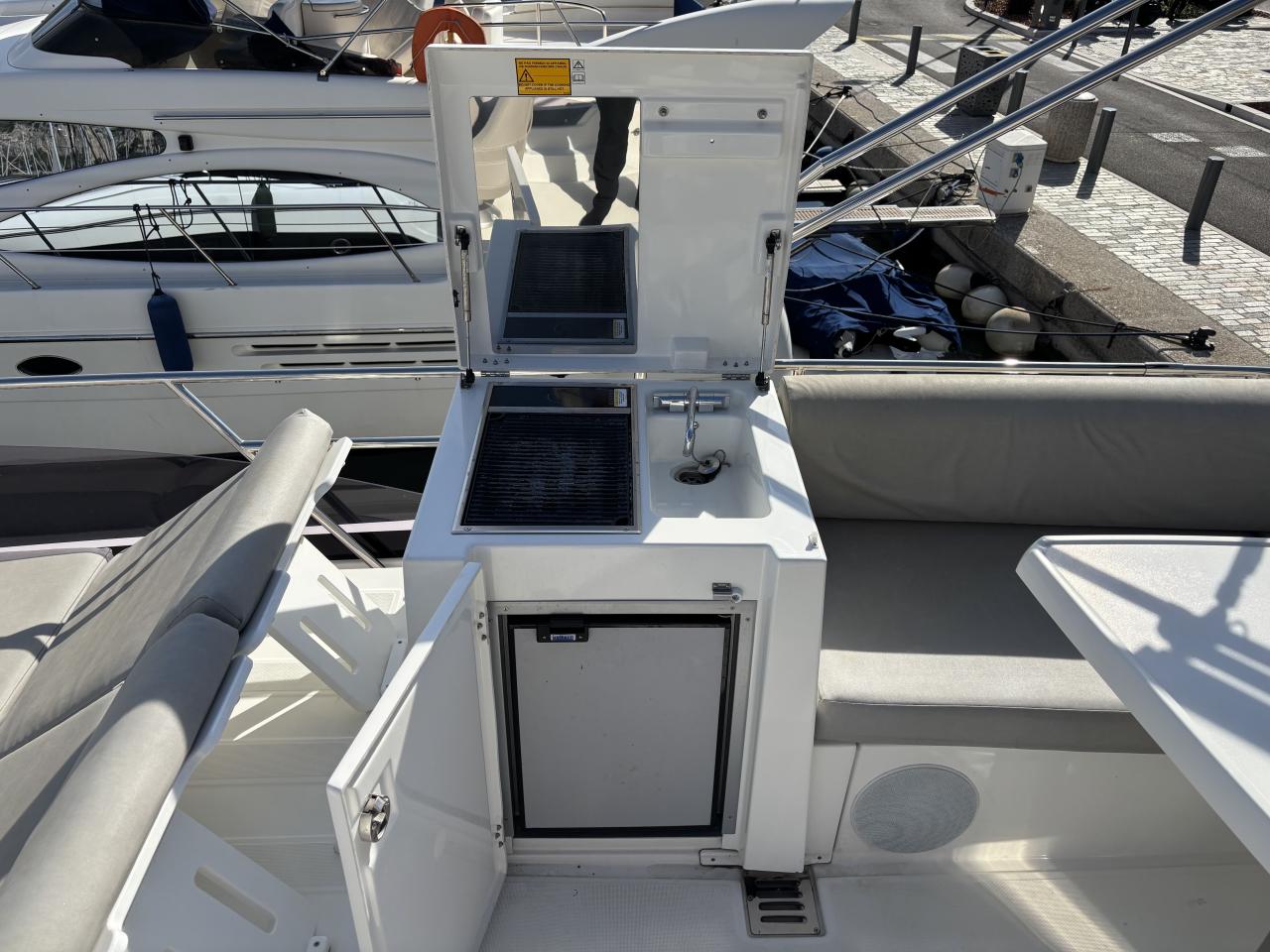 The yacht is fully equipped with a complete Raymarine navigation system including radar, GPS, AIS, autopilot and flybridge repeater. Comfort on board is ensured with air conditioning, generator, Bowers & Wilkins sound system and fully equipped galley.