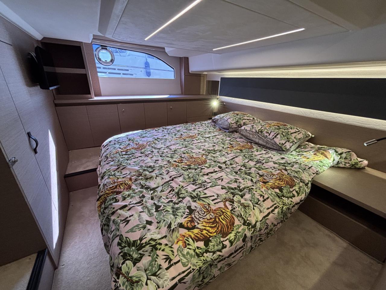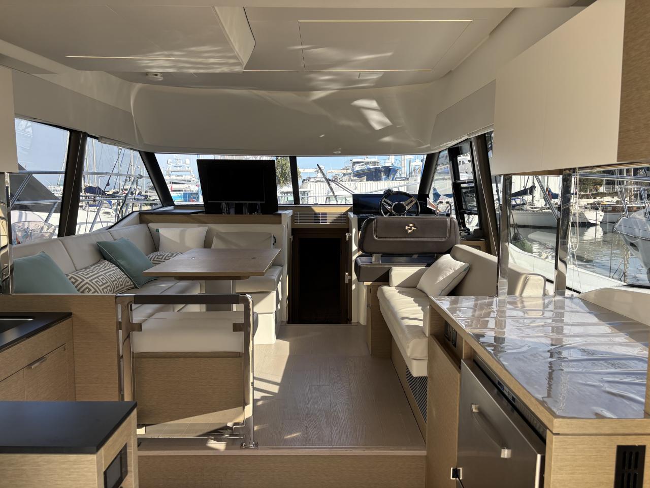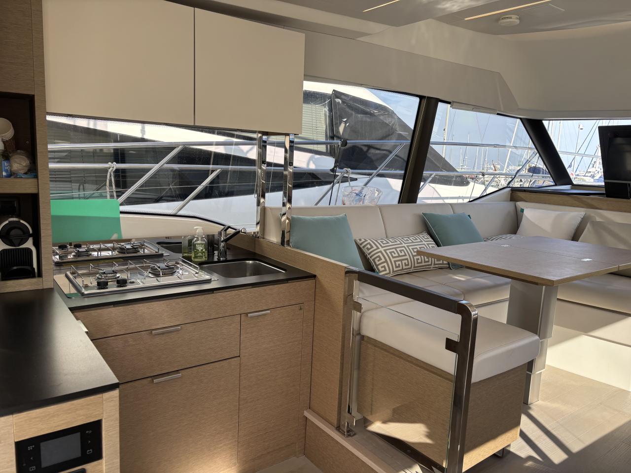 The 2 cabin 2 bathroom layout in grey oak finish offers a spacious and bright interior enhanced by large panoramic windows and exceptional sea views.