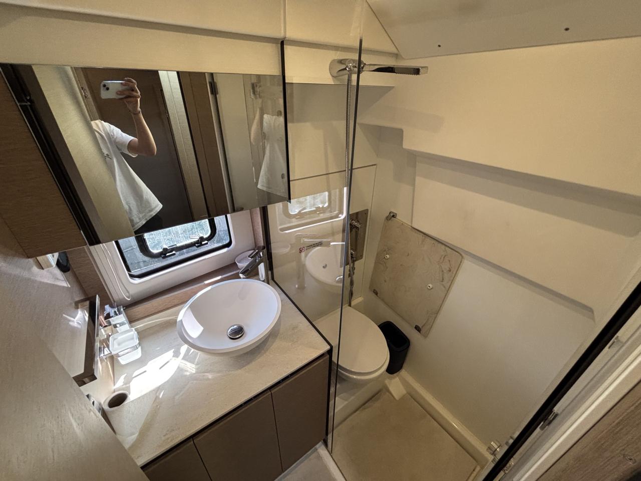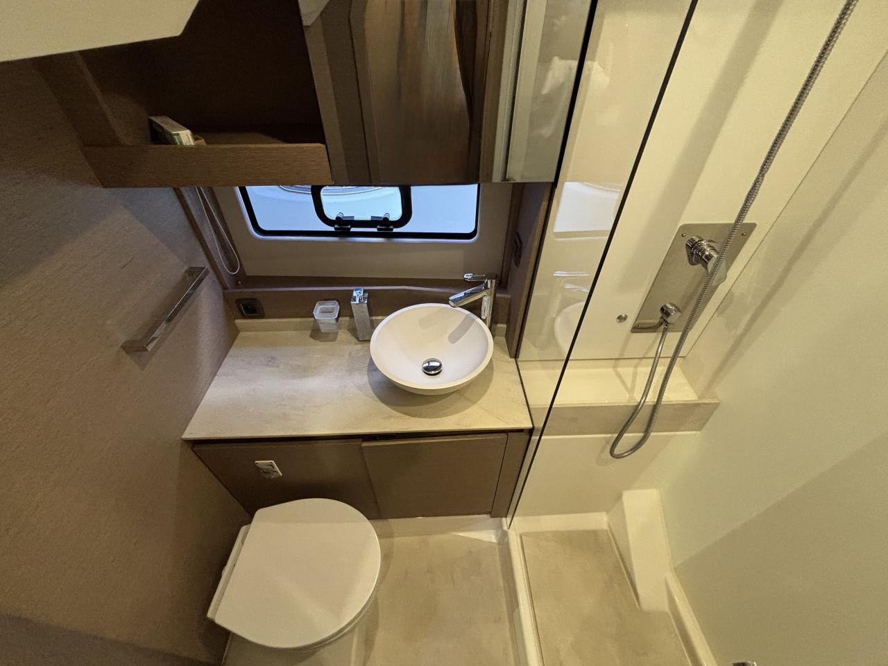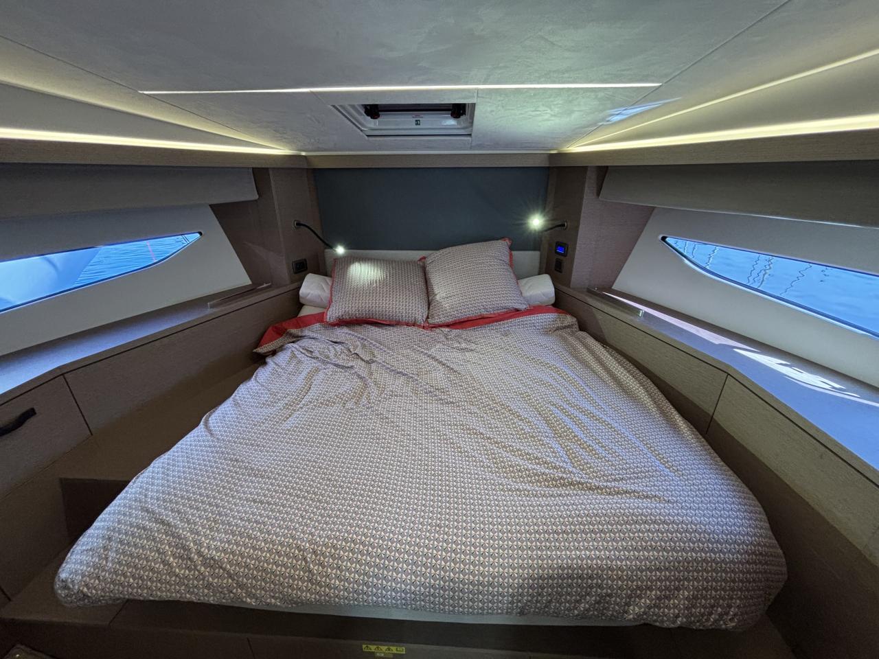 The 2 cabin 2 bathroom layout in grey oak finish offers a spacious and bright interior enhanced by large panoramic windows and exceptional sea views.