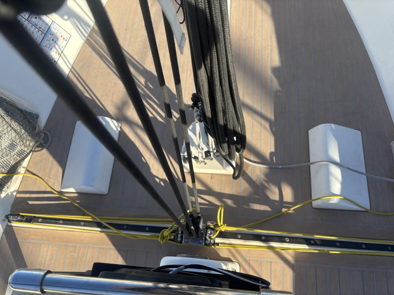 Extensive sail inventory with recent North and Doyle racing sails (2023–2024), asymmetric and symmetric spinnakers and Code Zero, plus cruising sails including North 3DI mainsail and genoa.