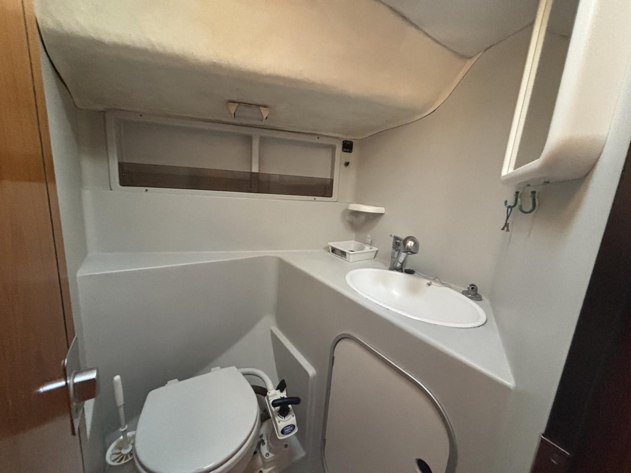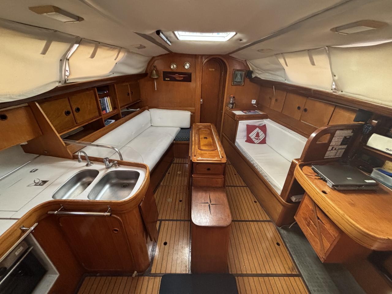 L'intérieur est composé d'un carré spacieux et lumineux avec une table centrale, des rangements optimisés, 3 cabines doubles, d'une salle d'eau avec wc.