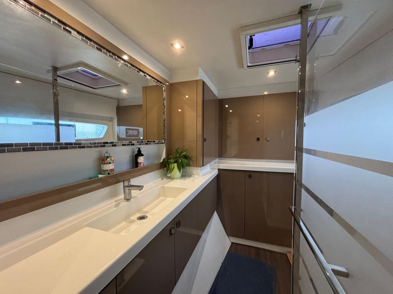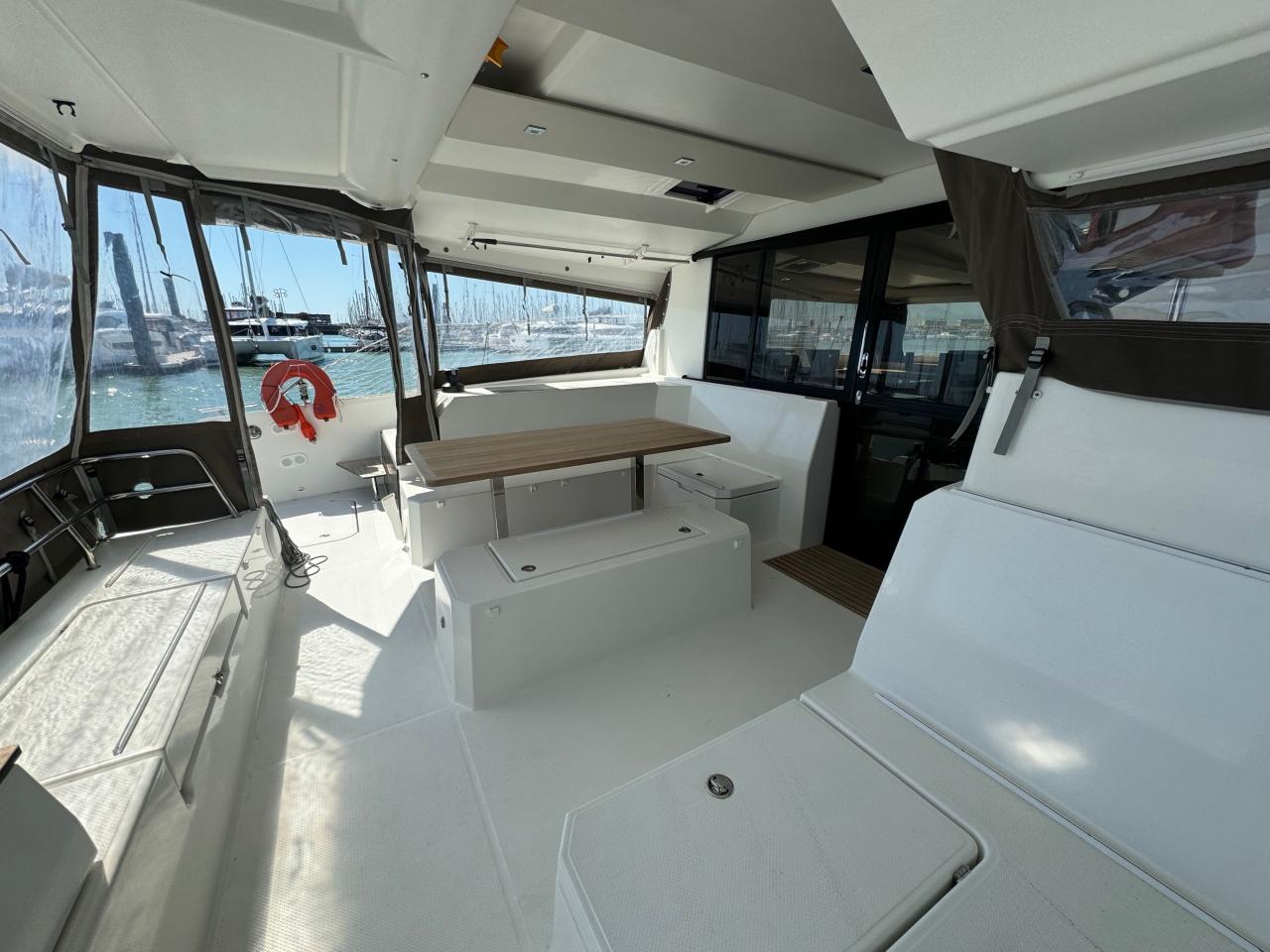 Dès l’embarquement, le bateau séduit par ses volumes généreux et sa luminosité exceptionnelle. Le carré panoramique, baigné de lumière naturelle grâce aux larges surfaces vitrées, offre une vue dégagée sur l’extérieur et crée une atmosphère chaleureuse et conviviale. L’aménagement intérieur est composé de 2 belles cabines doubles ainsi qu'une grande cabine propriétaire. Il a été pensé pour maximiser le confort en navigation comme au mouillage, avec des espaces de circulation fluides, des finitions soignées et de nombreux rangements. La cuisine, entièrement équipée, répond parfaitement aux exigences de la vie en mer et des longues escales : réfrigérateur, congélateur, four, plaques de cuisson et espaces de stockage généreux permettent une totale autonomie et un réel plaisir à bord, que ce soit pour un usage familial ou pour recevoir des invités ainsi que professionnel avec sa pointe bâbord aménagé.