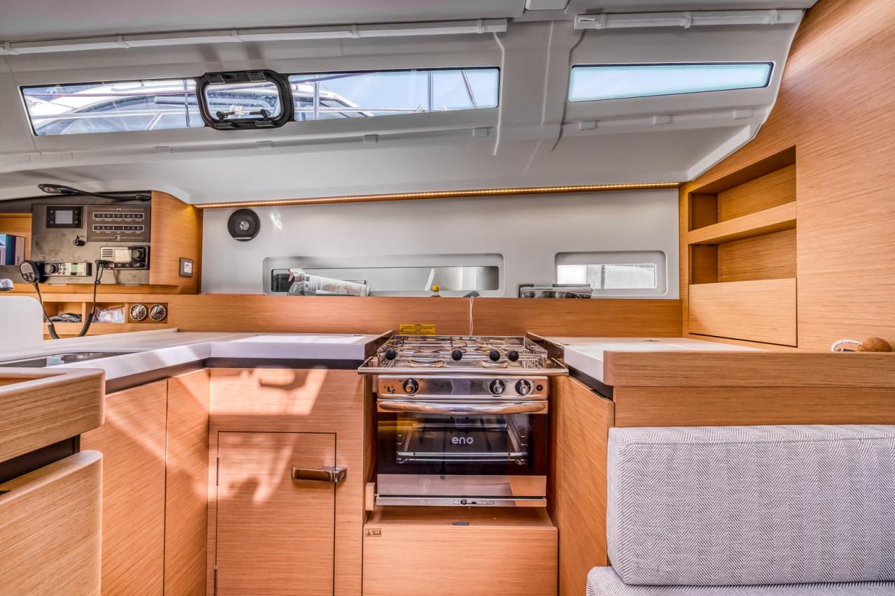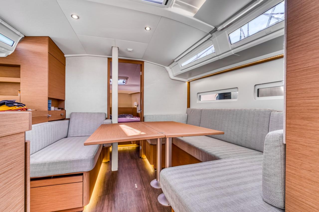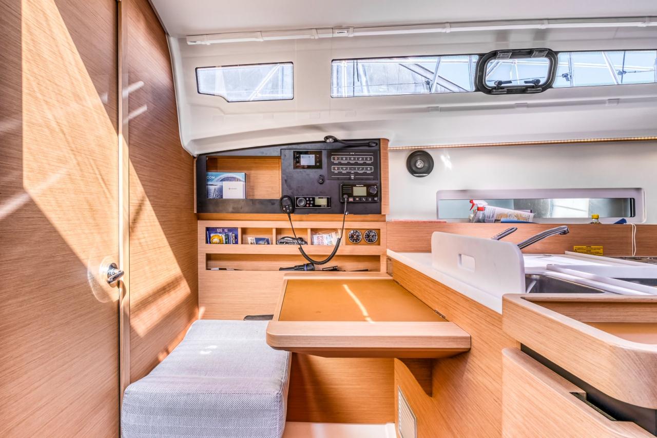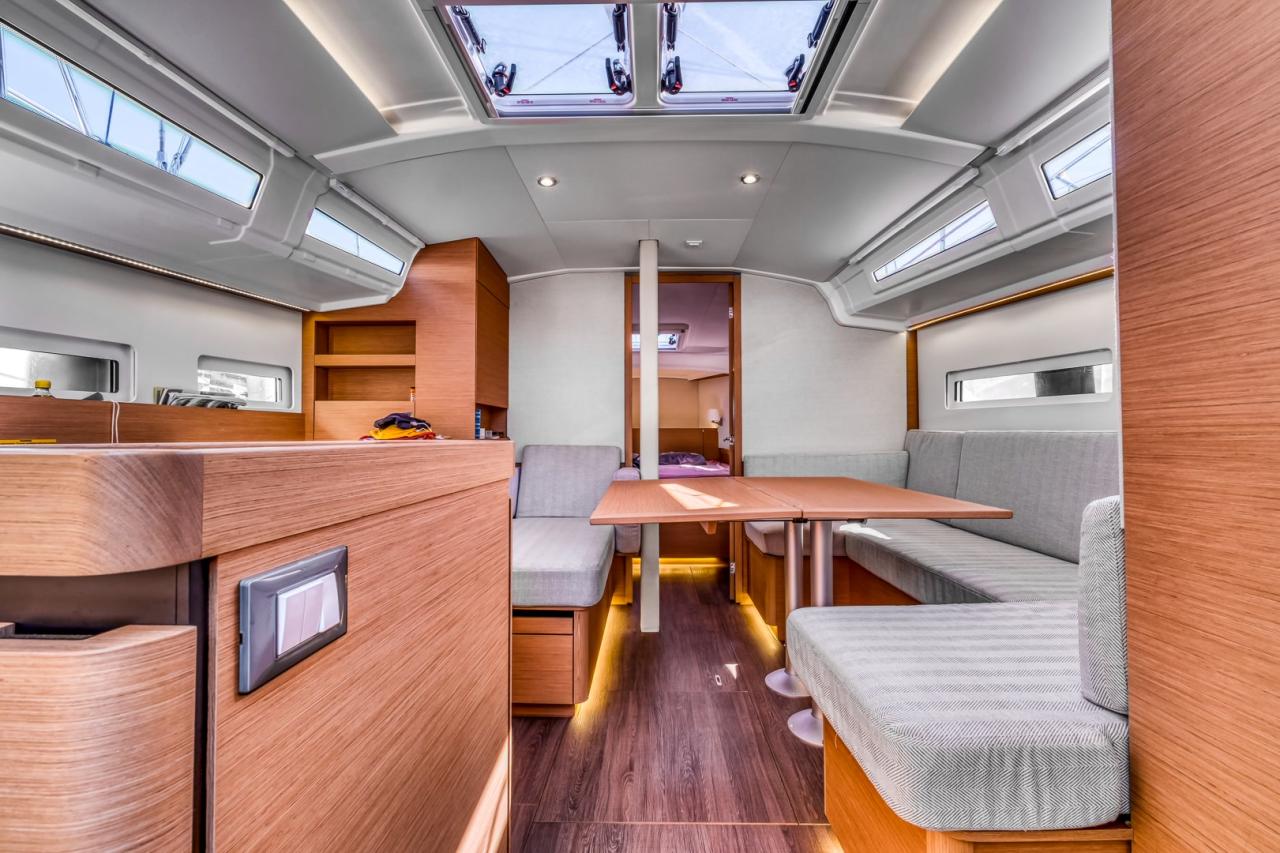 The deck layout is particularly well designed, featuring the model’s signature sloping side decks, which allow effortless and secure movement from the cockpit to the bow. The cockpit itself is spacious and welcoming, offering a true outdoor living area, ideal both for relaxing at anchor and for efficient sail handling. At the helm, the boat feels stable, responsive and well balanced, delivering a reassuring and enjoyable sailing experience in all conditions.