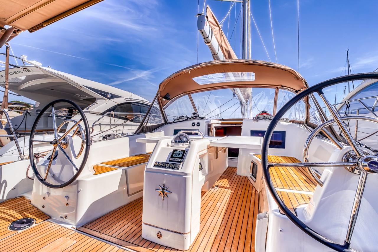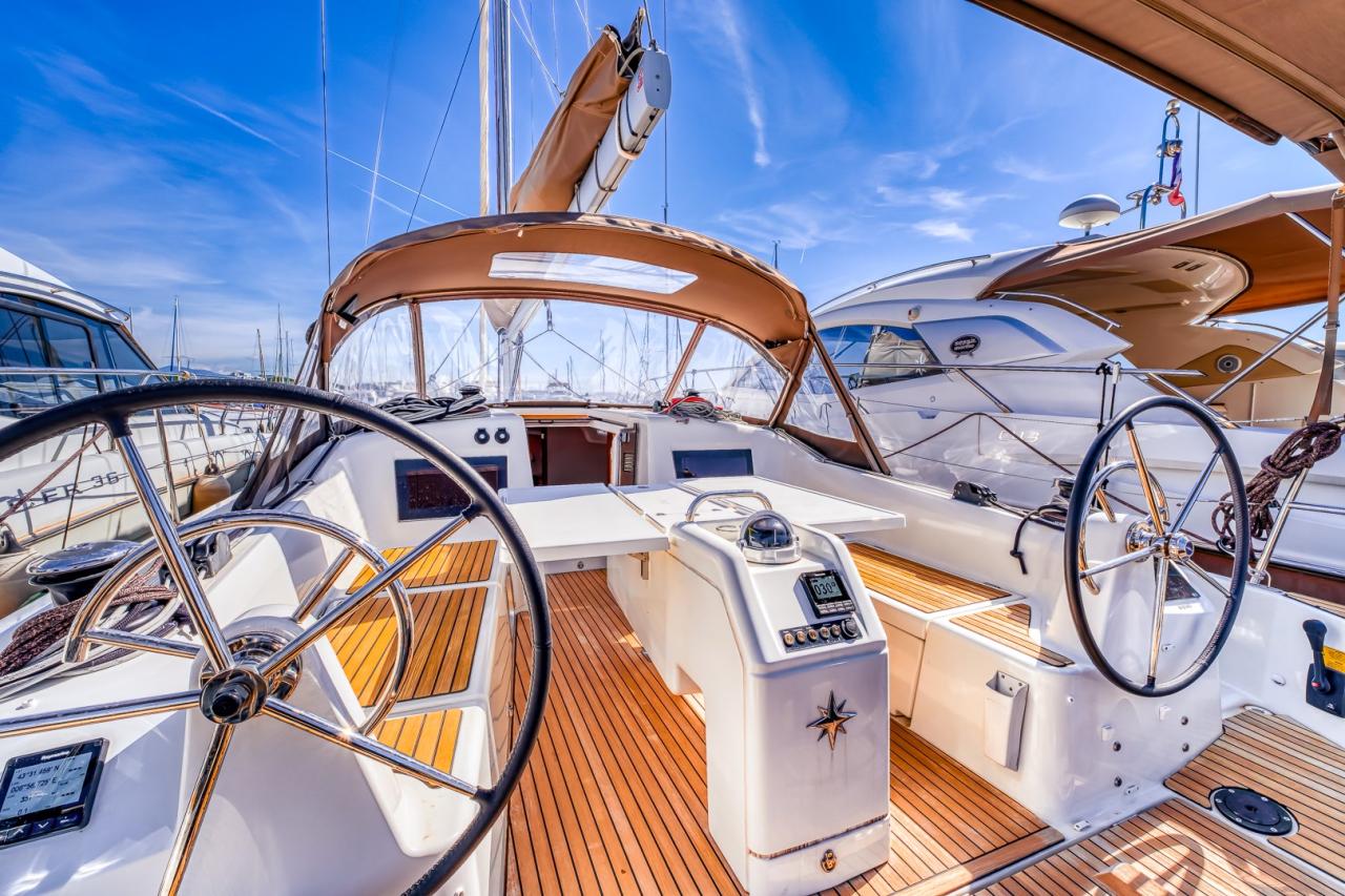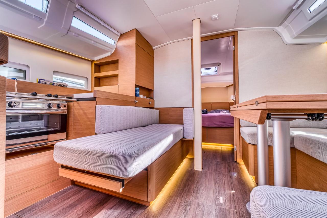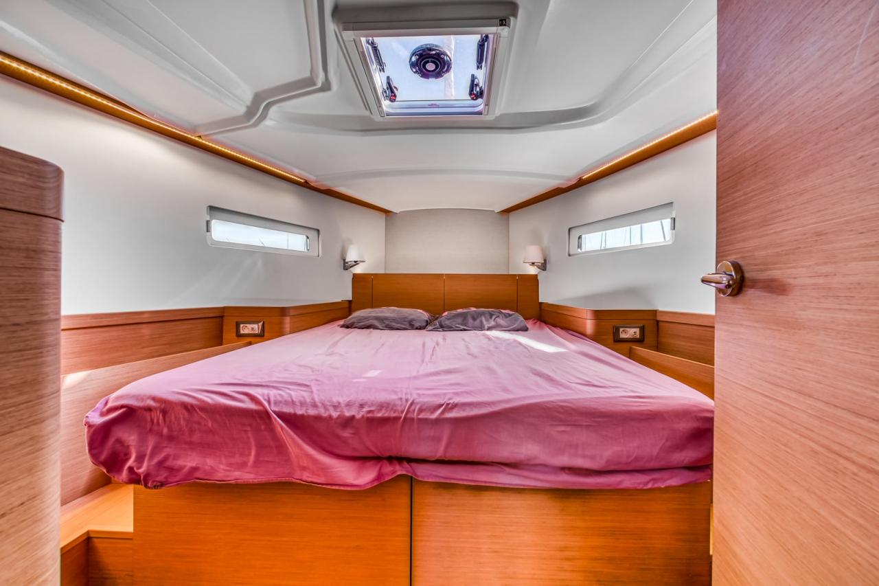 The deck layout is particularly well designed, featuring the model’s signature sloping side decks, which allow effortless and secure movement from the cockpit to the bow. The cockpit itself is spacious and welcoming, offering a true outdoor living area, ideal both for relaxing at anchor and for efficient sail handling. At the helm, the boat feels stable, responsive and well balanced, delivering a reassuring and enjoyable sailing experience in all conditions.