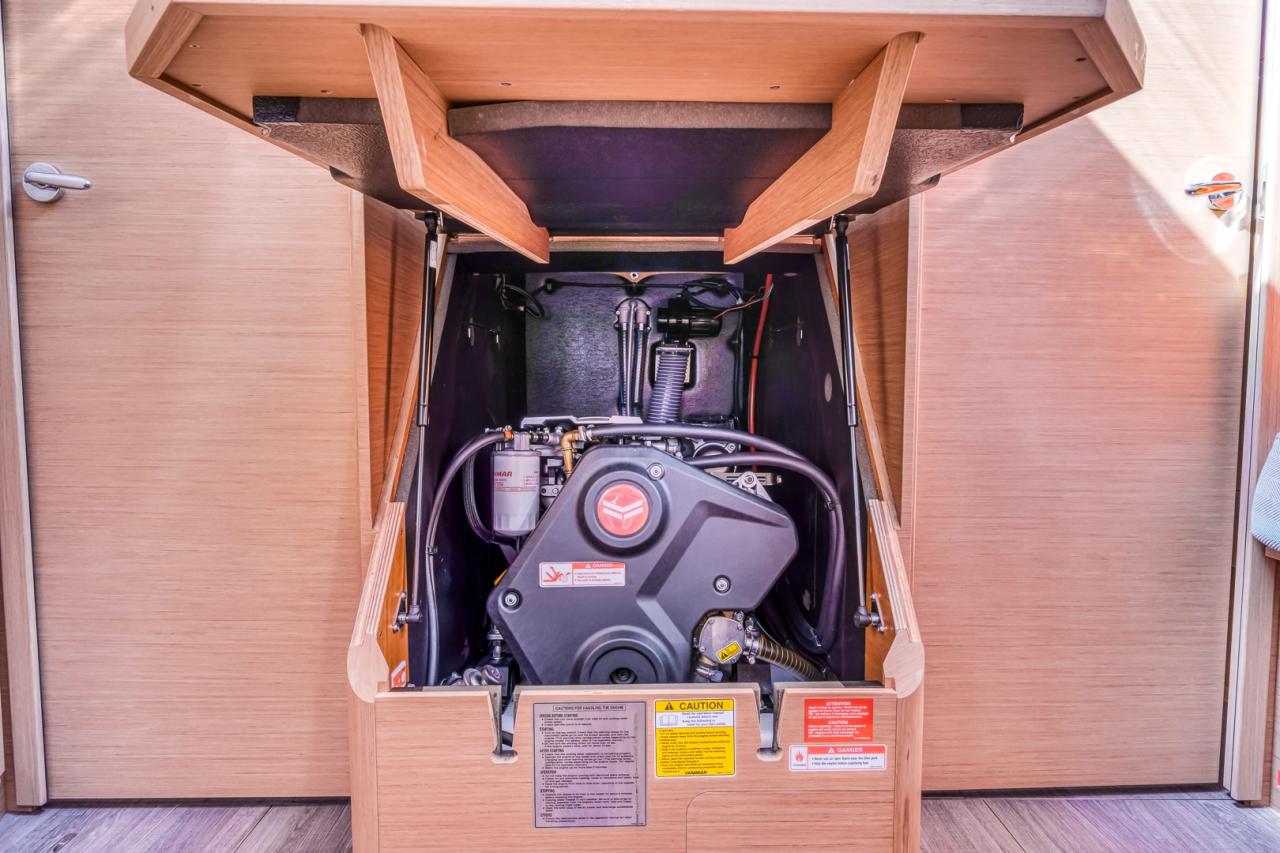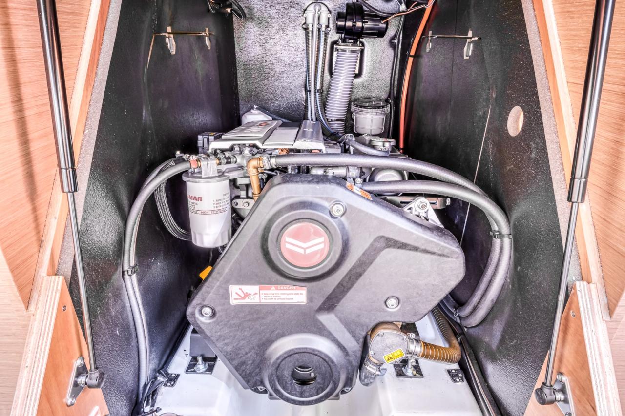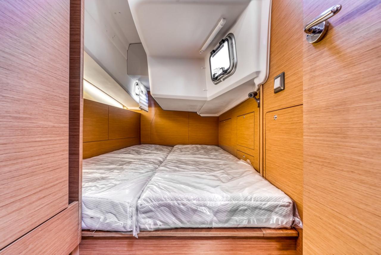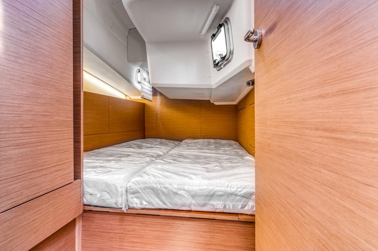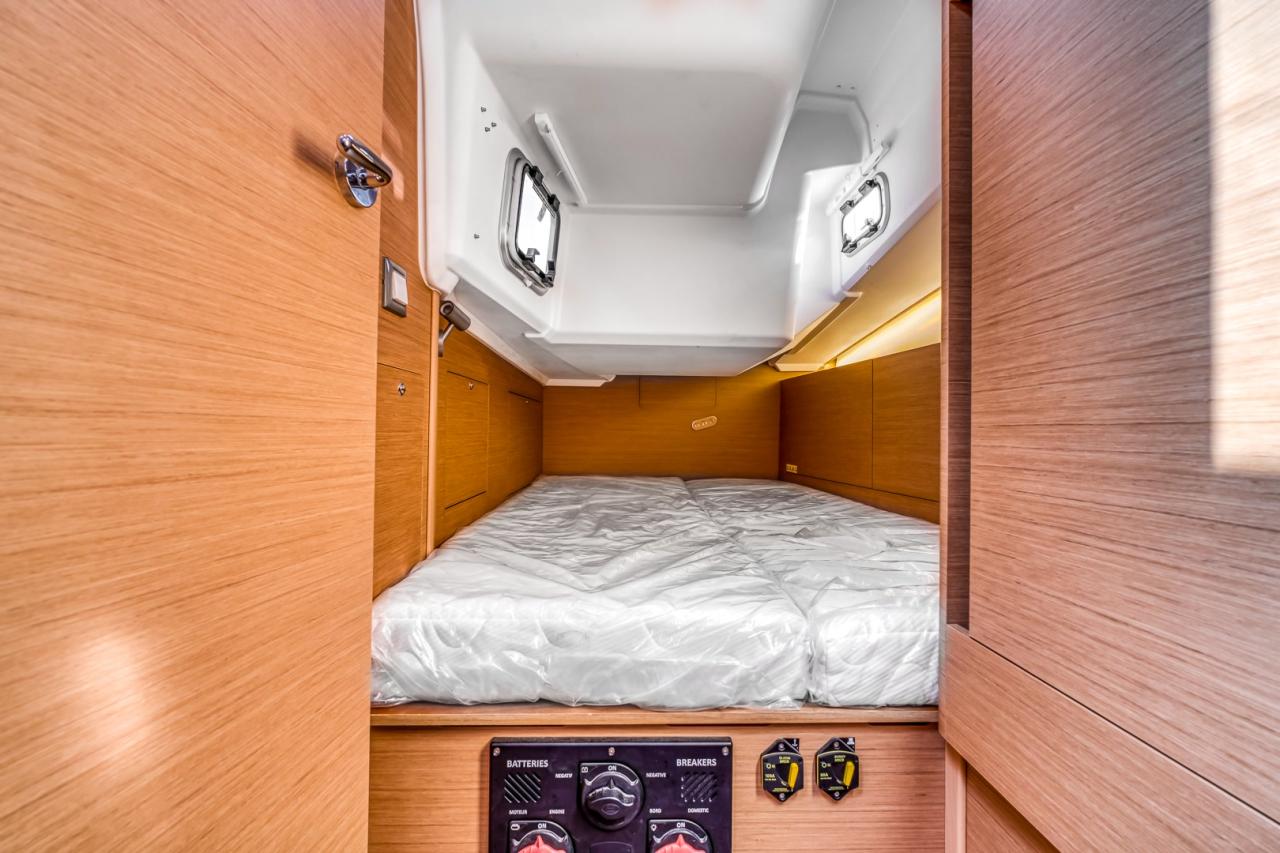 Below deck, the yacht offers a bright, refined and comfortable living space. The interior is enhanced by a slatted bed base in the forward cabin, an additional storage/dressing unit in the forward port cabin, and a luxury folding saloon table with fixed legs. Interior joinery features a dark oak laminated floor, while the cockpit sole is finished in teak, adding both elegance and durability.